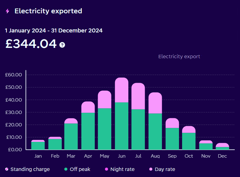 This bar chart shows my earnings for exported power during 2024, at the various time-of-day rates. I was very pleased with this: it cut my expenditure on electricity to under £592 for the year – which meant an average electricity bill of £49.31 per month.